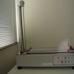 検査機に、切込みを入れたエアセルマットをセットし、振り子の勢いでエアセルマットを引き裂きます。