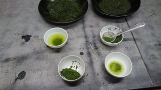 2. 粗揉:蒸熱後の茶葉に熱風を当てながら揉み込み、茶葉の水分を減らす工程