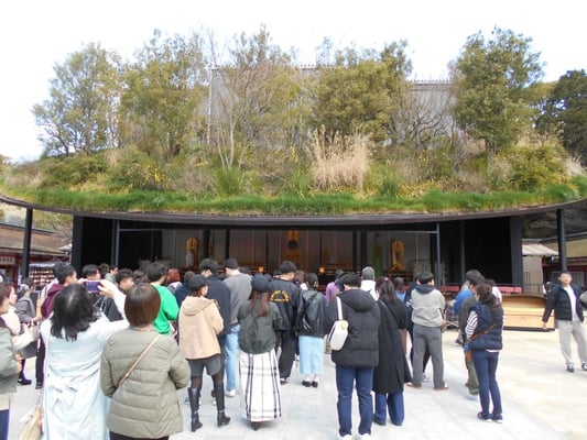 現在神殿の普請中で、屋根に緑が植えられている仮殿が立てられていました。