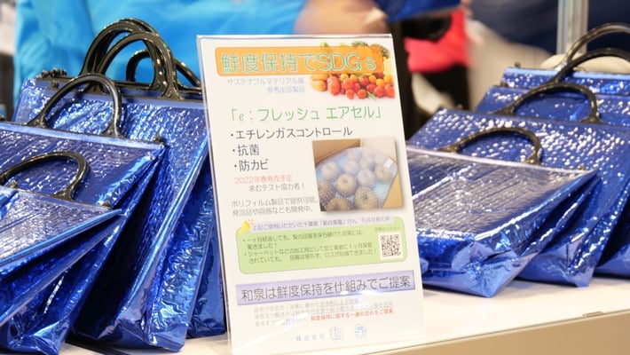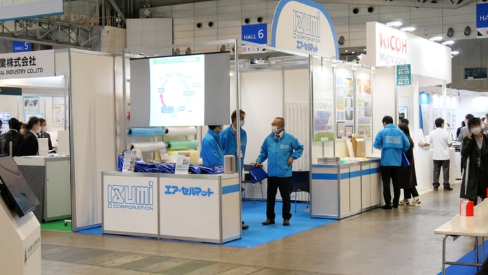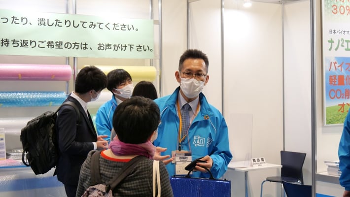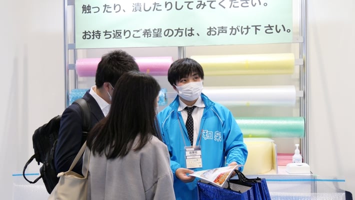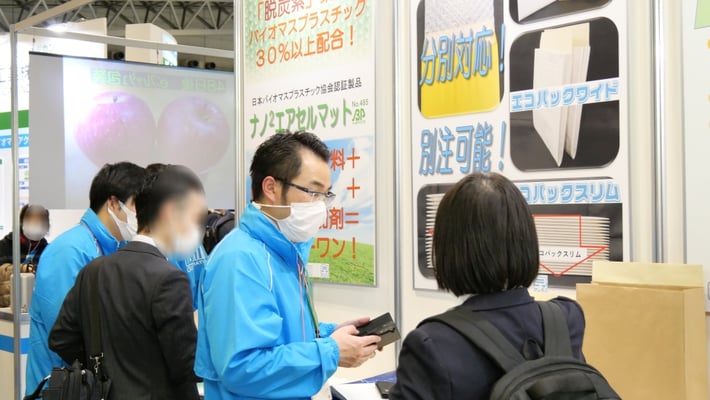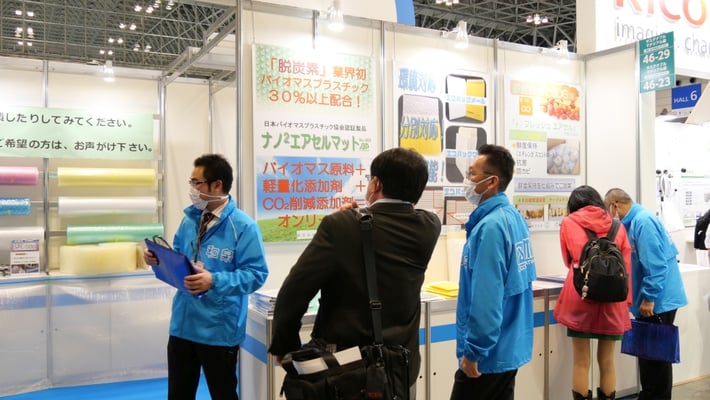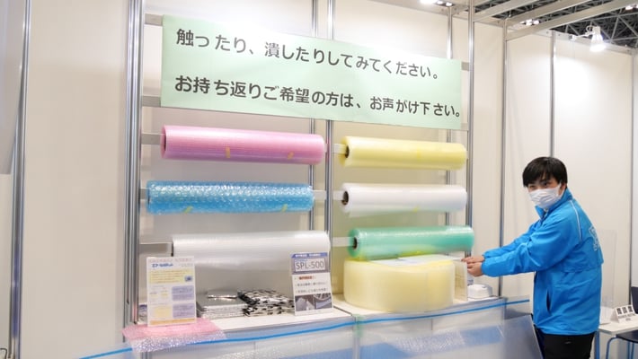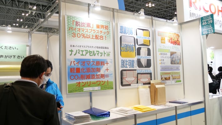 和泉ブースでは、バイオマスプラスチックを使った環境に優しい気泡緩衝材「ナノ2エアセルマット」、緩衝封筒の「エコパック」、鮮度保持エアセル「e:フレッシュ」を前面に、ブース内部に各種エアセルマットを展示しました。